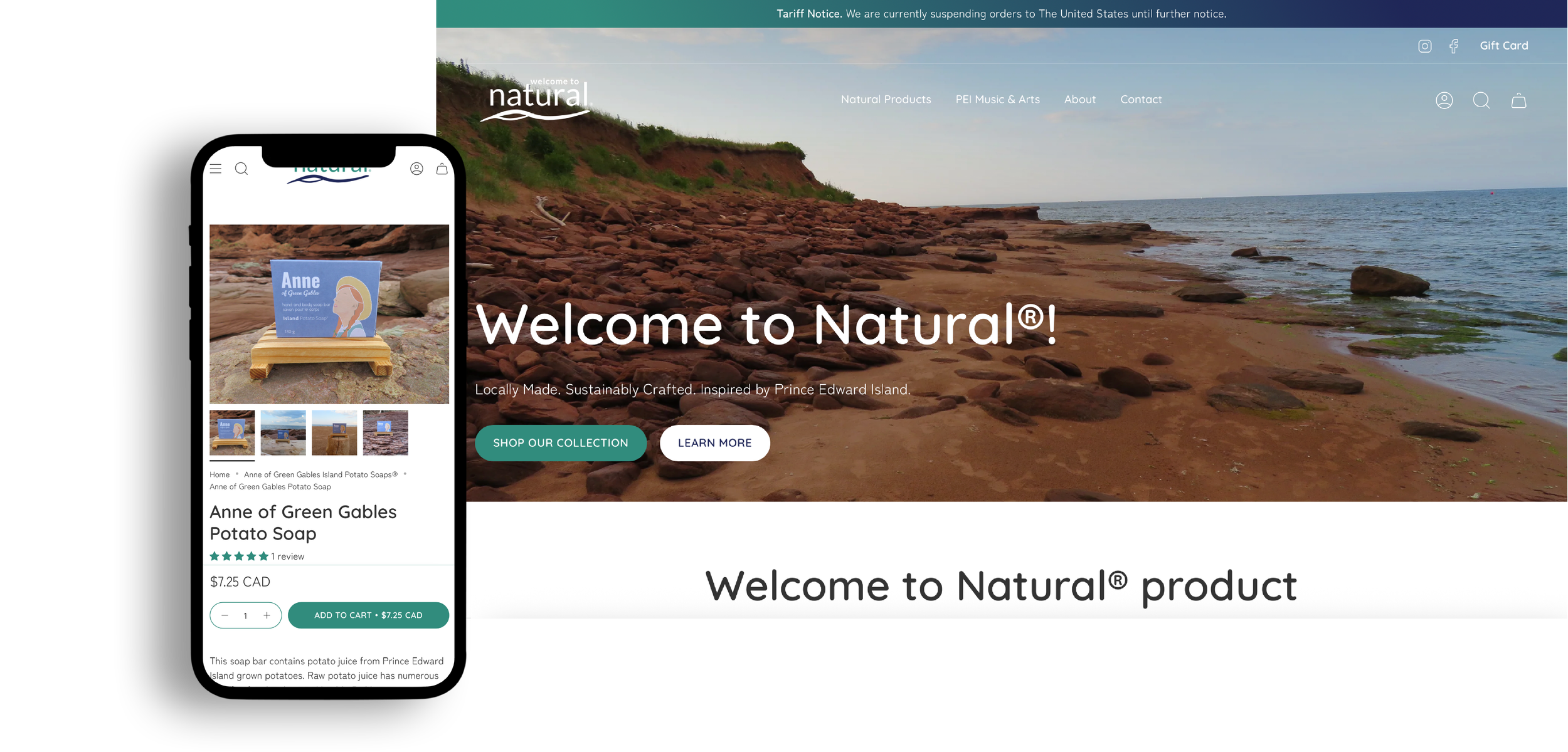 The home page showcases their best-selling natural products, local music collection and establishes the Welcome to Natural core values. We included sections with links to their About and Island Potato Soap pages, the foundation of their new brand. We included a Made in Canada section which reiterates the Welcome to Natural mission.